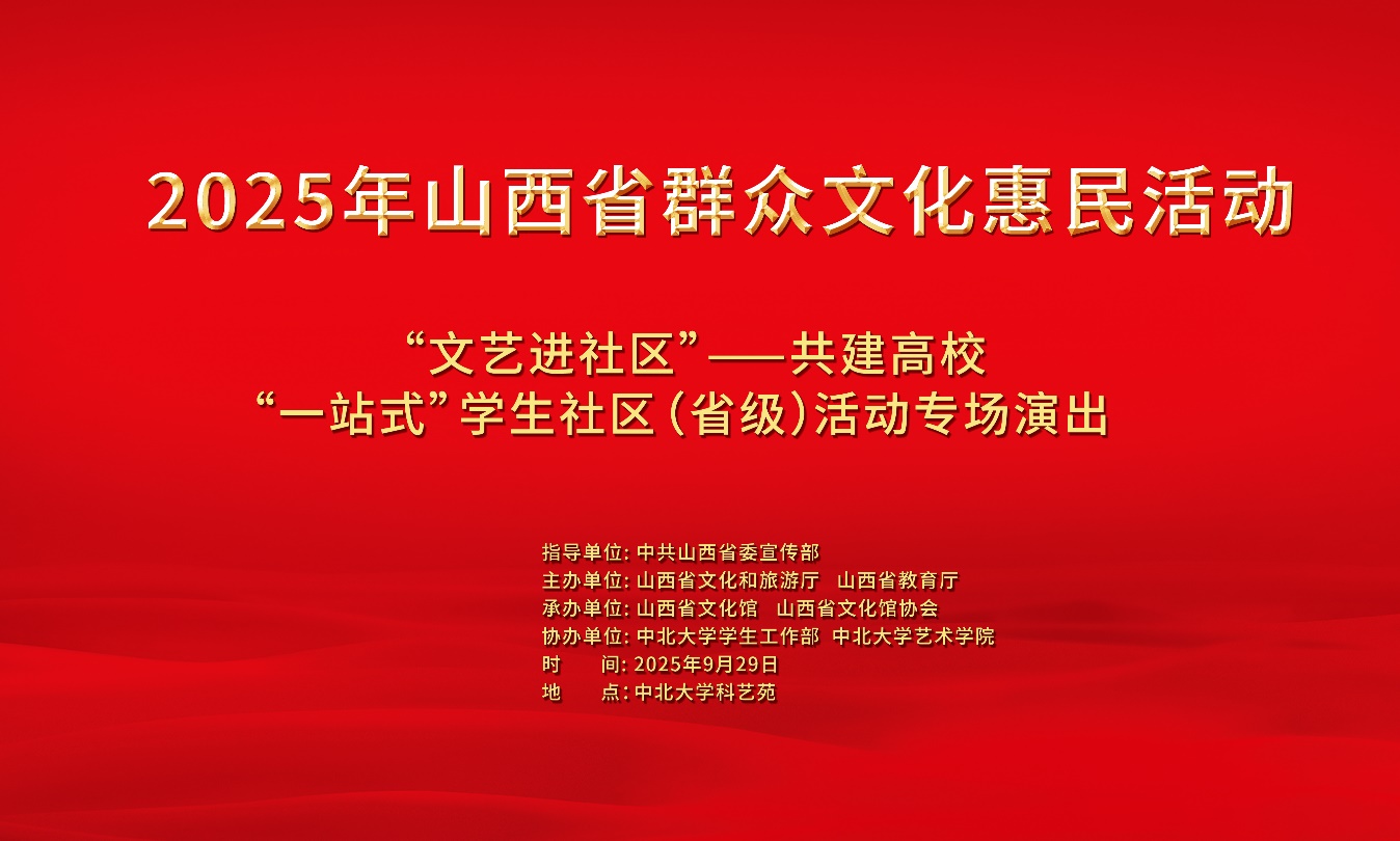 深入贯彻习近平文化思想,全面落实立德树人根本任务,在高?!耙徽臼健毖缜帕ε嘤图猩缁嶂饕搴诵募壑倒郏罅胙镏谢判愦澄幕⒏锩幕蜕缁嶂饕逑冉幕?,让大学生在丰富多彩的社区文化浸润中成长成才。2025年山西省群众文化惠民活动“文艺进社区”——共建高?!耙徽臼健毖缜ㄊ〖叮┗疃ǔ⊙莩鼋?025年9月29日15:00在中北大学科艺苑举办。届时,山西公共文化云、山西省文化馆官方抖音号、视频号将同步直播,敬请收看。